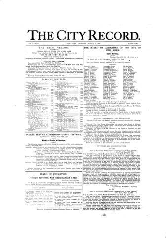 The City Record newspaper publishes notices which includes but is not limited to: public hearings and meetings, public auctions and sales, solicitations and awards and official rules proposed and adopted by city agencies. This is the City Record Newspaper for March 17, 1910.