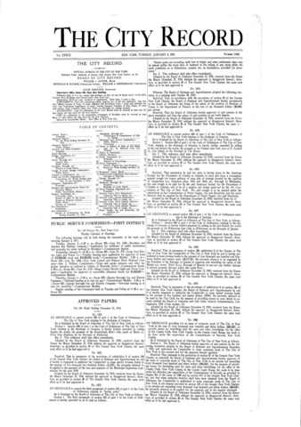 The City Record newspaper publishes notices which includes but is not limited to: public hearings and meetings, public auctions and sales, solicitations and awards and official rules proposed and adopted by city agencies. This is the City Record Newspaper for January 03, 1911.