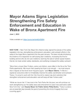 Mayor Adams Signs Legislation Strengthening Fire Safety Enforcement and Education in Wake of Bronx Apartment Fire