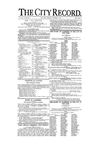 The City Record newspaper publishes notices which includes but is not limited to: public hearings and meetings, public auctions and sales, solicitations and awards and official rules proposed and adopted by city agencies. This is the City Record Newspaper for November 11, 1915.