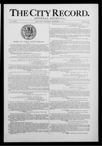 The City Record newspaper publishes notices which includes but is not limited to: public hearings and meetings, public auctions and sales, solicitations and awards and official rules proposed and adopted by city agencies. This is the City Record Newspaper for September 05, 1900.