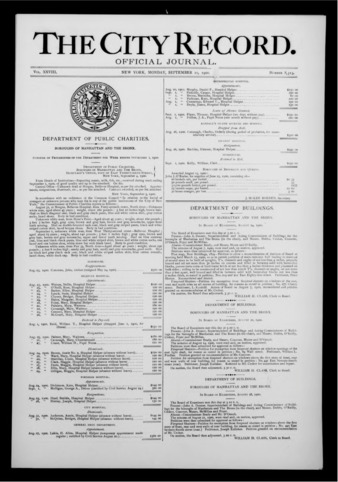 The City Record newspaper publishes notices which includes but is not limited to: public hearings and meetings, public auctions and sales, solicitations and awards and official rules proposed and adopted by city agencies. This is the City Record Newspaper for September 10, 1900.