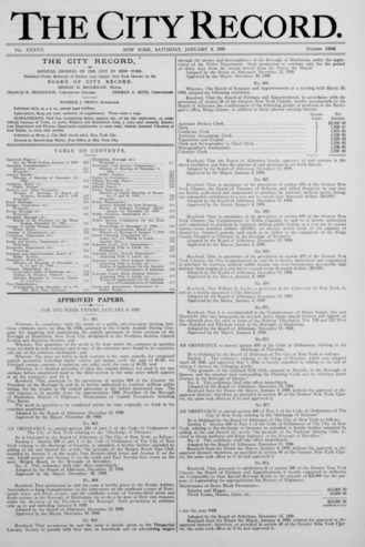 The City Record newspaper publishes notices which includes but is not limited to: public hearings and meetings, public auctions and sales, solicitations and awards and official rules proposed and adopted by city agencies. This is the City Record Newspaper for January 09, 1909.
