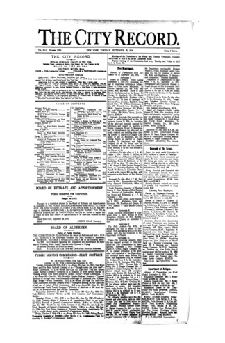 The City Record newspaper publishes notices which includes but is not limited to: public hearings and meetings, public auctions and sales, solicitations and awards and official rules proposed and adopted by city agencies. This is the City Record Newspaper for September 28, 1914.