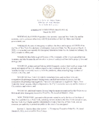 Emergency Executive Order No. 62 extends section 1 of Emergency Executive Order No. 59, dated March 19, 2022, for 5 days, and Amends section 3 of EEO 50 to allow entertainers and athletes to compete during the COVID-19 pandemic.