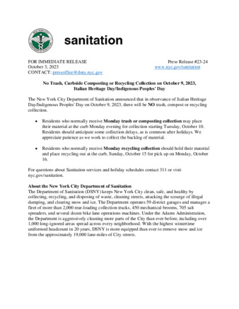 DSNY announced that in observance of Italian Heritage Day/Indigenous Peoples' Day on October 9, 2023, there will be NO trash, compost or recycling collection.