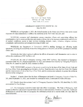 Emergency Executive Order No. 104, extends Emergency Executive Order No. 100, dated May 23, 2022, for five (5) days, if this relates to Rikers.