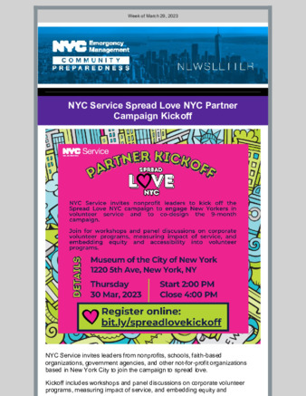 The NYCEM Community Preparedness newsletter provides information about preparedness initiatives, resources and local events to community and faith-based organizations, leaders and the general public of New York City. During emergencies, important alerts and updates are issued to all who subscribe.