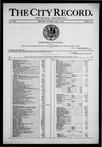 The City Record newspaper publishes notices which includes but is not limited to: public hearings and meetings, public auctions and sales, solicitations and awards and official rules proposed and adopted by city agencies. This is the City Record Newspaper for May 17, 1899.