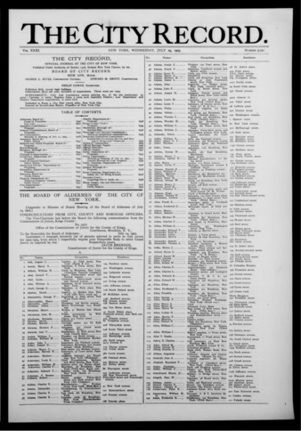 The City Record newspaper publishes notices which includes but is not limited to: public hearings and meetings, public auctions and sales, solicitations and awards and official rules proposed and adopted by city agencies. This is the City Record Newspaper for July 29, 1903 with supplement.