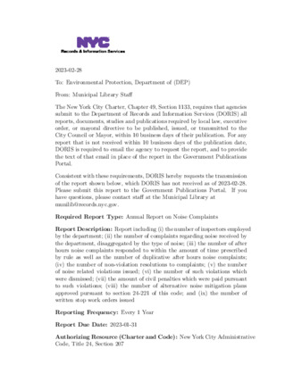 Report including (i) the number of inspectors employed by the department; (ii) the number of complaints regarding noise received by the department, disaggregated by the type of noise; (iii) the number of after hours noise complaints responded to within the amount of time prescribed by rule as well as the number of duplicative after hours noise complaints; (iv) the number of non-violation resolutions to complaints; (v) the number of noise related violations issued; (vi) the number of such violations which were dismissed; (vii) the amount of civil penalties which were paid pursuant to such violations; (viii) the number of alternative noise mitigation plans approved pursuant to section 24-221 of this code; and (ix) the number of written stop work orders issued
