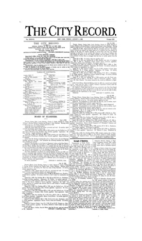 The City Record newspaper publishes notices which includes but is not limited to: public hearings and meetings, public auctions and sales, solicitations and awards and official rules proposed and adopted by city agencies. This is the City Record Newspaper for August 05, 1910.