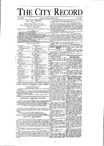 The City Record newspaper publishes notices which includes but is not limited to: public hearings and meetings, public auctions and sales, solicitations and awards and official rules proposed and adopted by city agencies. This is the City Record Newspaper for March 10, 1911.