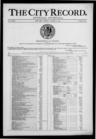 The City Record newspaper publishes notices which includes but is not limited to: public hearings and meetings, public auctions and sales, solicitations and awards and official rules proposed and adopted by city agencies. This is the City Record Newspaper for January 17, 1899.