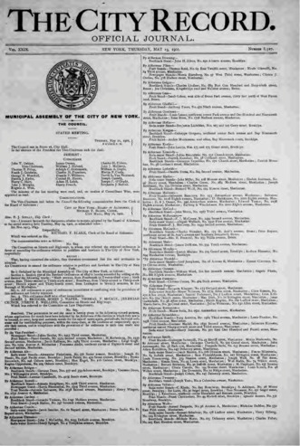 The City Record newspaper publishes notices which includes but is not limited to: public hearings and meetings, public auctions and sales, solicitations and awards and official rules proposed and adopted by city agencies. This is the City Record Newspaper for May 23, 1901.