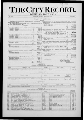 The City Record newspaper publishes notices which includes but is not limited to: public hearings and meetings, public auctions and sales, solicitations and awards and official rules proposed and adopted by city agencies. This is the City Record Newspaper for February 04, 1902.