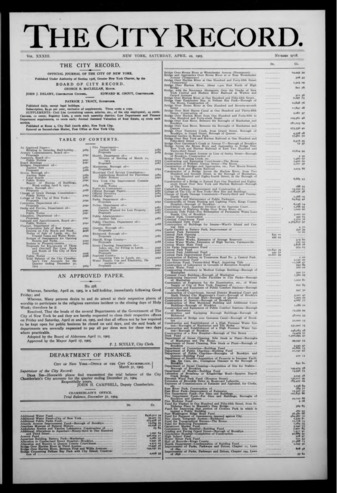 The City Record newspaper publishes notices which includes but is not limited to: public hearings and meetings, public auctions and sales, solicitations and awards and official rules proposed and adopted by city agencies. This is the City Record Newspaper for April 22, 1905.