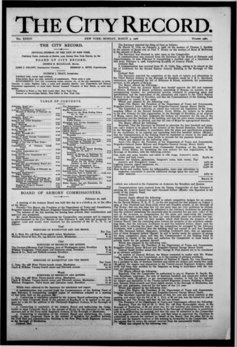 The City Record newspaper publishes notices which includes but is not limited to: public hearings and meetings, public auctions and sales, solicitations and awards and official rules proposed and adopted by city agencies. This is the City Record Newspaper for March 05, 1906.
