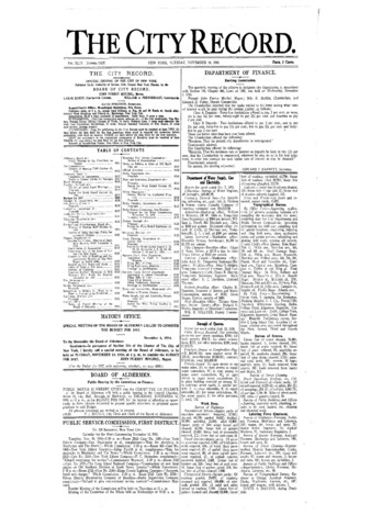 The City Record newspaper publishes notices which includes but is not limited to: public hearings and meetings, public auctions and sales, solicitations and awards and official rules proposed and adopted by city agencies. This is the City Record Newspaper for November 14, 1916.