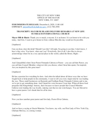 Mayor's Press Release: MAYOR DE BLASIO DELIVERS REMARKS AT NEW LIFE OUTREACH INTERNATIONAL CHURCH