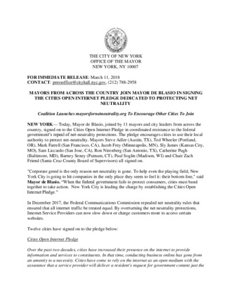 Press Release: MAYORS FROM ACROSS THE COUNTRY JOIN MAYOR DE BLASIO IN SIGNING THE CITIES OPEN INTERNET PLEDGE DEDICATED TO PROTECTING NET NEUTRALITY