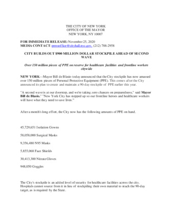 Mayor's Press Release: CITY BUILDS OUT $900 MILLION DOLLAR STOCKPILE AHEAD OF SECOND WAVE
