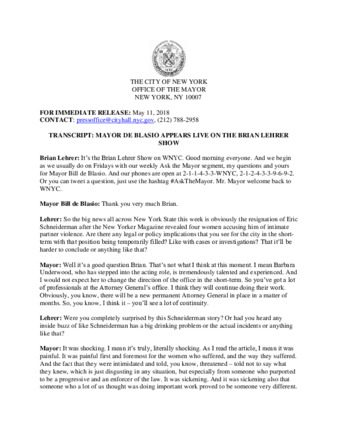 Press Release: TRANSCRIPT: MAYOR DE BLASIO APPEARS LIVE ON THE BRIAN LEHRER SHOW