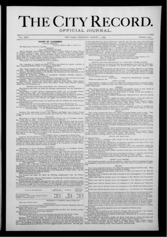 The City Record newspaper publishes notices which includes but is not limited to: public hearings and meetings, public auctions and sales, solicitations and awards and official rules proposed and adopted by city agencies. This is the City Record Newspaper for March 05, 1896.