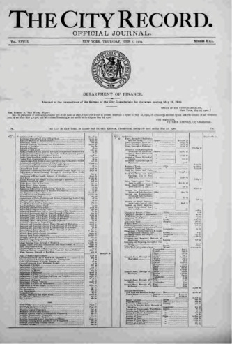 The City Record newspaper publishes notices which includes but is not limited to: public hearings and meetings, public auctions and sales, solicitations and awards and official rules proposed and adopted by city agencies. This is the City Record Newspaper for June 07, 1900.
