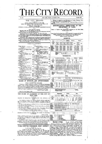 The City Record newspaper publishes notices which includes but is not limited to: public hearings and meetings, public auctions and sales, solicitations and awards and official rules proposed and adopted by city agencies. This is the City Record Newspaper for October 18, 1912.