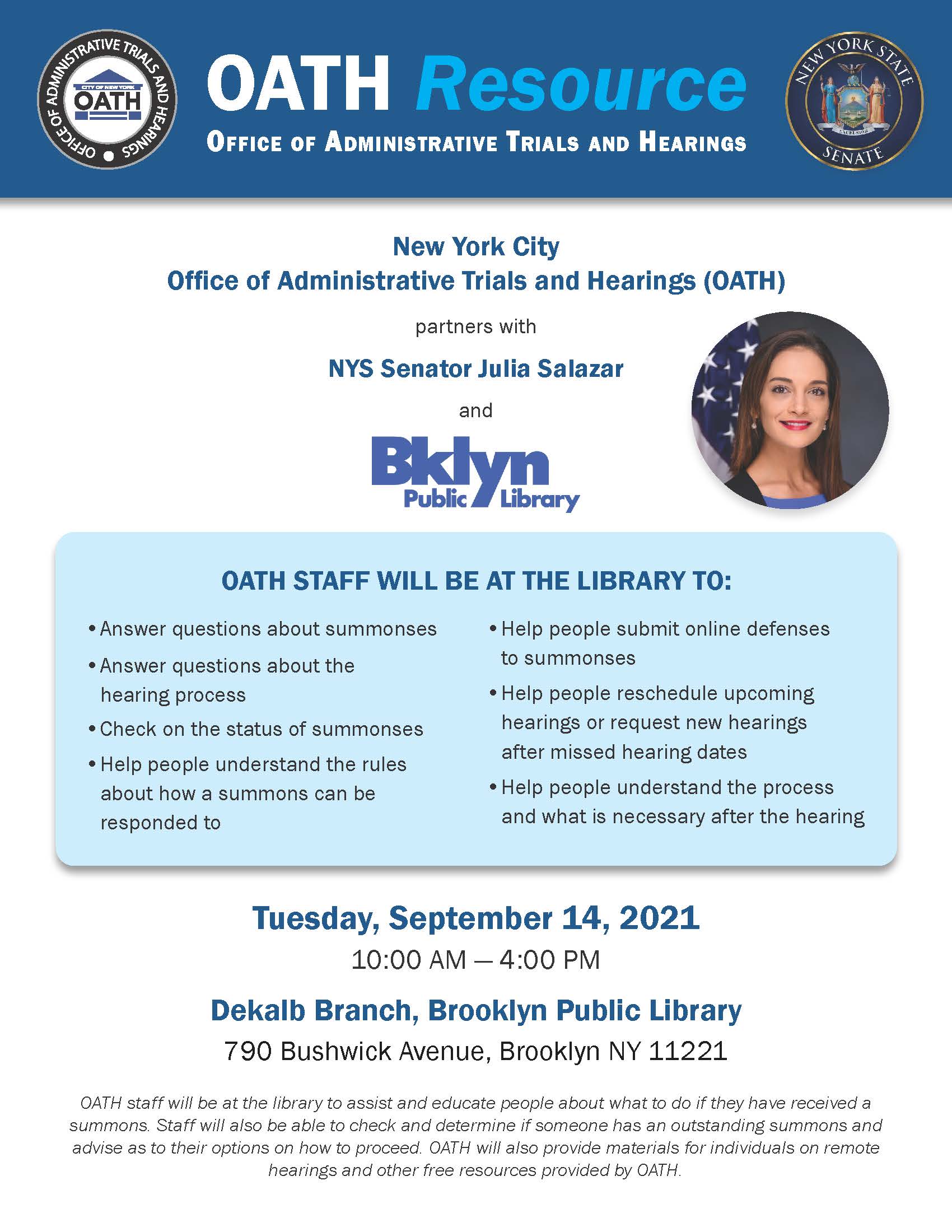 OATH staff were at the library to assist and educate people about what to do should they have received a summons and to check to determine if someone has an outstanding summons. Materials about remote hearings and other free resources were provided to the public as well.