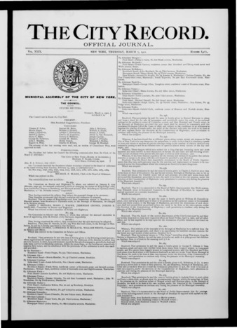 The City Record newspaper publishes notices which includes but is not limited to: public hearings and meetings, public auctions and sales, solicitations and awards and official rules proposed and adopted by city agencies. This is the City Record Newspaper for March 07, 1901.