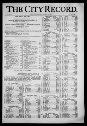 The City Record newspaper publishes notices which includes but is not limited to: public hearings and meetings, public auctions and sales, solicitations and awards and official rules proposed and adopted by city agencies. This is the City Record Newspaper for October 14, 1907.