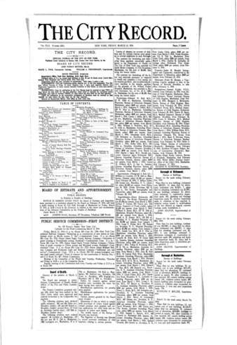 The City Record newspaper publishes notices which includes but is not limited to: public hearings and meetings, public auctions and sales, solicitations and awards and official rules proposed and adopted by city agencies. This is the City Record Newspaper for March 13, 1914 with supplement.