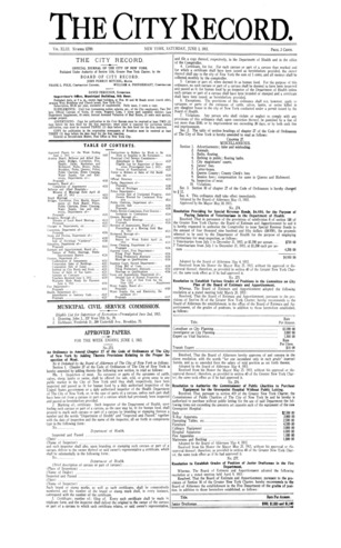 The City Record newspaper publishes notices which includes but is not limited to: public hearings and meetings, public auctions and sales, solicitations and awards and official rules proposed and adopted by city agencies. This is the City Record Newspaper for June 05, 1915.