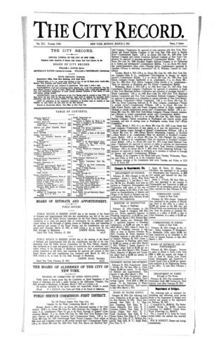 The City Record newspaper publishes notices which includes but is not limited to: public hearings and meetings, public auctions and sales, solicitations and awards and official rules proposed and adopted by city agencies. This is the City Record Newspaper for March 03, 1913.