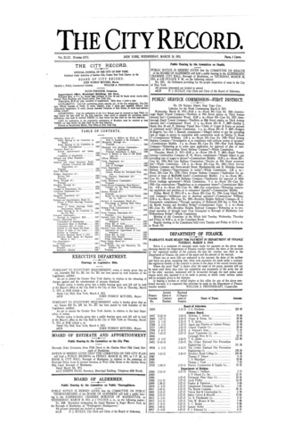 The City Record newspaper publishes notices which includes but is not limited to: public hearings and meetings, public auctions and sales, solicitations and awards and official rules proposed and adopted by city agencies. This is the City Record Newspaper for March 10, 1915.