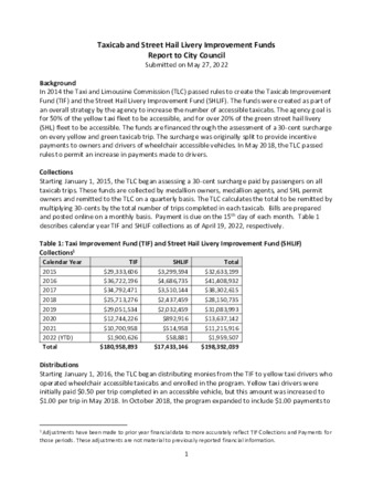 This report is an analysis of the adequacy of the Taxi Improvement Fund, which is used by the the Taxi & Limousine Commission to encourage the use of Wheelchair Accessible Vehicles.