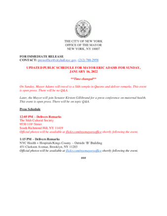 UPDATED PUBLIC SCHEDULE FOR MAYOR ERIC ADAMS FOR SUNDAY, JANUARY 16, 2022