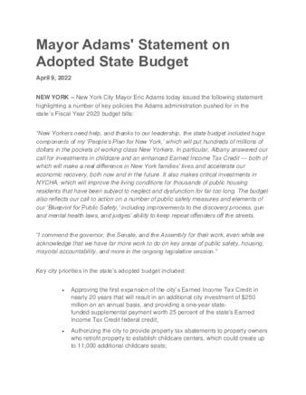 Mayor Adams' Statement on Adopted State Budget