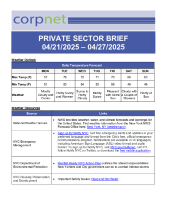 - NYCEM CorpNet Public-Private Sector Weekly Incident Brief 04-21-25