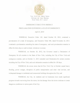The Mayor of New York City issues a Proclamation Extending a State of Emergency due to storm damages.