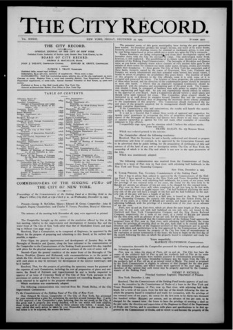 The City Record newspaper publishes notices which includes but is not limited to: public hearings and meetings, public auctions and sales, solicitations and awards and official rules proposed and adopted by city agencies. This is the City Record Newspaper for December 22, 1905.