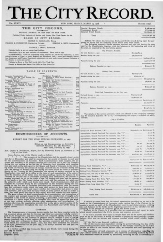 The City Record newspaper publishes notices which includes but is not limited to: public hearings and meetings, public auctions and sales, solicitations and awards and official rules proposed and adopted by city agencies. This is the City Record Newspaper for March 13, 1908.