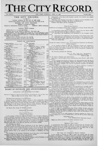 The City Record newspaper publishes notices which includes but is not limited to: public hearings and meetings, public auctions and sales, solicitations and awards and official rules proposed and adopted by city agencies. This is the City Record Newspaper for April 16, 1908.