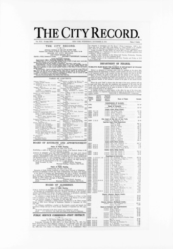 The City Record newspaper publishes notices which includes but is not limited to: public hearings and meetings, public auctions and sales, solicitations and awards and official rules proposed and adopted by city agencies. This is the City Record Newspaper for November 25, 1914.