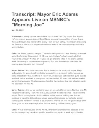 A transcript about New York City Mayor Eric Adams appearing live on MSNBC's "Morning Joe," regarding gun control and the criminal justice system.