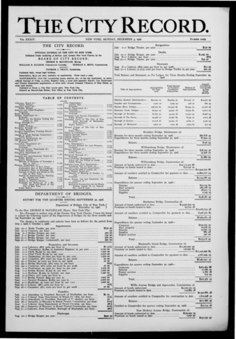 The City Record newspaper publishes notices which includes but is not limited to: public hearings and meetings, public auctions and sales, solicitations and awards and official rules proposed and adopted by city agencies. This is the City Record Newspaper for December 03, 1906.