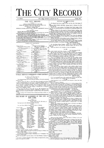 The City Record newspaper publishes notices which includes but is not limited to: public hearings and meetings, public auctions and sales, solicitations and awards and official rules proposed and adopted by city agencies. This is the City Record Newspaper for January 26, 1911.
