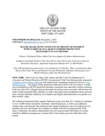 Mayor Adams, DCWP Announce $38 Million Settlement With Starbucks in Largest Worker Protection Settlement in City History